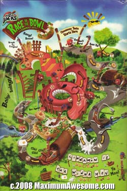 So let’s recap the Apple Jacks universe as depicted on this cereal box vignette. CinnaMon is a quasi-literate conga player who runs for his life from spiteful little apples trying to murder him. During these daily chases, CinnaMon often encounters gigantic slides, cereal spoons and some sort of sledding device affixed to very, very short railroad tracks (bottom middle). I don’t pretend to understand your world, CinnaMon, but I will take this opportunity to say that Bob Marley sucks.