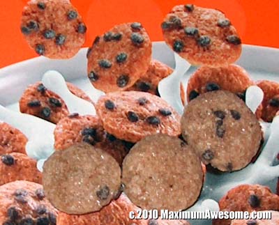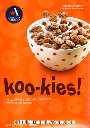 I thumbed through a lot of cereal to find the one on the right. Most look like the other two: sadly devoid of chocolate chips. That is some penny pinching right there. A metric ton of miniature chocolate chip flakes costs what, two cents? Gimme an extra dash or two of them chips, Kookies.